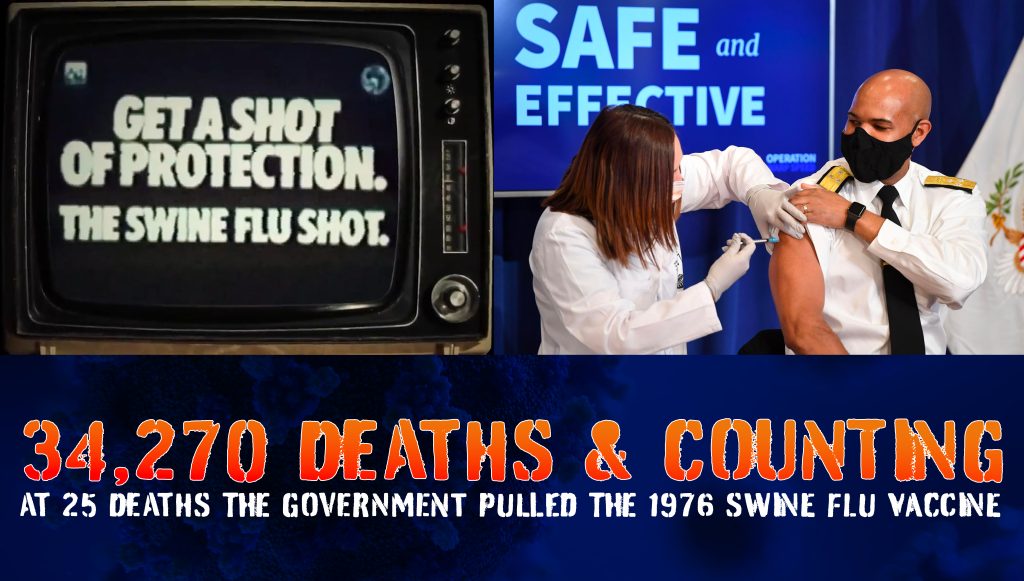 | 25 people died of vaccine-induced Guillain-Barré syndrome and the government halted the vaccine program on December 16, 1976. | 34,270 people died of the Covid-19 vaccine and 1,517,779 adverse events are reported on CDC’s VAERS database.