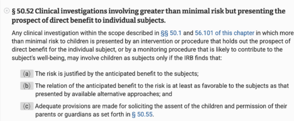 On July 20, 2022, Dr. Peter Marks confirmed the 45 CFR 46 risk category for children as “greater than minimal risk.” We differed in our opinion of “prospect of direct benefit”: