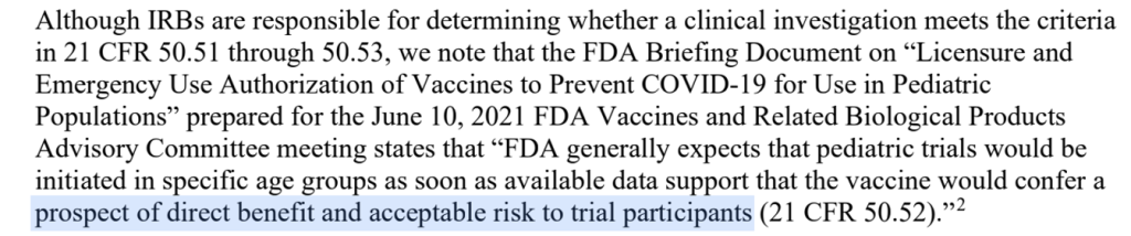 - “FDA does not believe that human subjects in any ongoing COVID-19 vaccine clinical trial under IND including pediatric or pregnant subjects (including those that do not specifically exclude pregnant or pediatric individuals) are or would be exposed to an unreasonable and significant risk of illness or injury.” https://www.regulations.gov/document/FDA-2022-P-0086-0024