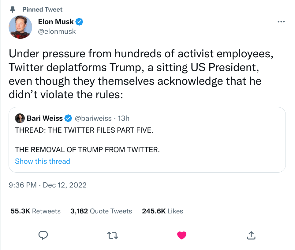 - Twitter Files Part Five Released:Â Part Five was released by Bari Weiss. It details what happened at Twitter on January 8, 2021 leading up to the removal of President Trump from Twitter. Facing immense pressure from employees within Twitter, as well as external pressures, the leadership at Twitter took the action of banning Trump’s account. Leadership included CEO Jack Dorsey, Head of Legal and Trust, Vijaya Gadde, and Head of Trust and Safety, Yoel Roth.