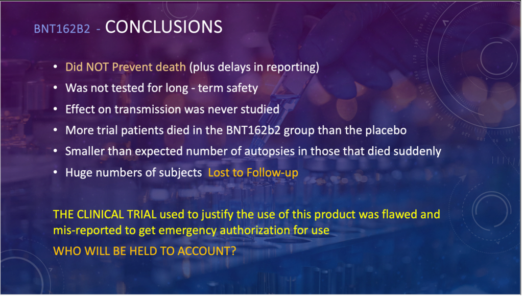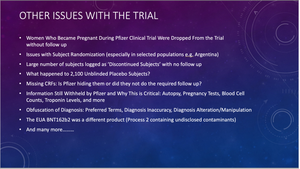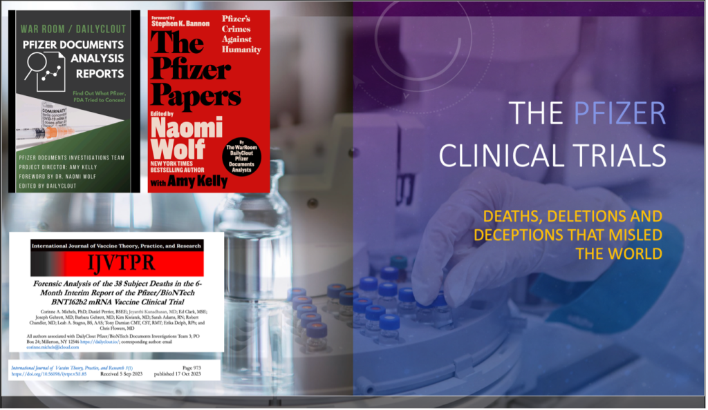 “My name is Dr. Chris Flowers. I am the medical lead of the WarRoom/DailyClout 3,400 volunteers of crowd-sourced citizens reviewing the Pfizer documents under the leadership of Dr. Naomi Wolf. Our reports have been published in two books, and the subject of today’s talk includes the peer-reviewed publication by Team 3 about our forensic examination of the Pfizer clinical trial.”