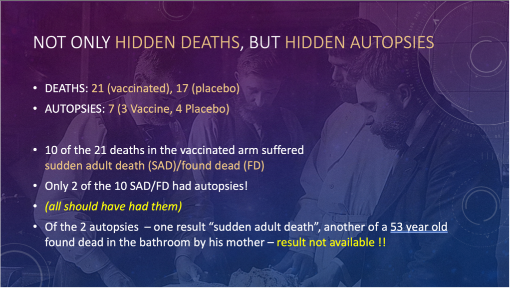 - Out of the 21 deaths in the vaccine arm of the trial, 10 suffered SUDDEN ADULT DEATH (SAD) or were Found Dead (FD).