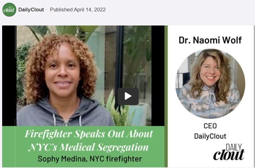 In this video, Dr. Naomi Wolf interviews New York Firefighter, Sophy Medina, about New York State’s treatment of front line workers. While Medina risked her life everyday on the job, her employment was terminated as soon as she provided an exemption to receiving the vaccine. The NYC Fire Department claimed that her exemption would “cause undo hardship.”