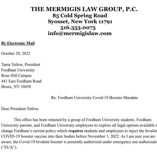With little choice and the compliance deadline only a few days away, Fordham Families Together have retained The Mermigis Law Group. The law group sent a letter to Fordham stating that the University is “deliberately taking away each student’s statutorily guaranteed right to decide whether to accept or refuse administration of the COVID-19 vaccines” and “[t]o avoid litigation….reverse the bivalent COVID-19 booster requirement.”