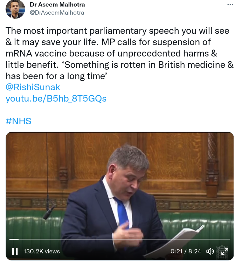 1- Andrew Bridgen, Member of the UK Parliament, gave a speech yesterday in which he called for halting the COVID vaccine program immediately. MP Bridgen revealed an overt coverup of research by a leading member of the British Heart Foundation that connected heart inflammation with mRNA vaccines.