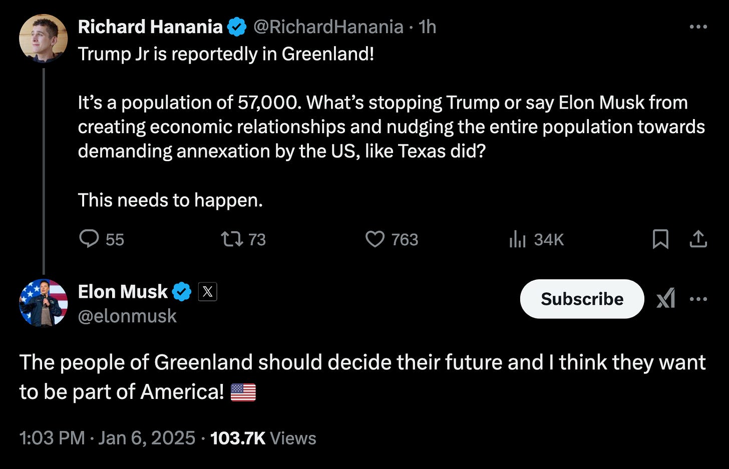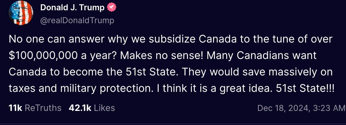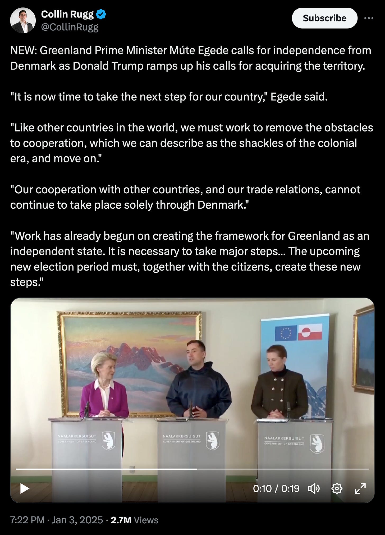 I have no idea if Greenland and Canada will eventually be purchased or annexed or absorbed into the United States of America — but that’s clearly the plan right now.