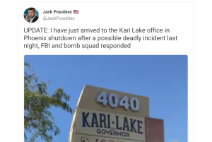 BREAKING: Envelopes filled with a “white powdery substance” were found at Kari Lake’s campaign office. FBI, Phoenix PD and Hazmat teams are on the ground.