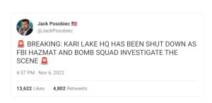 BREAKING: Envelopes filled with a “white powdery substance” were found at Kari Lake’s campaign office. FBI, Phoenix PD and Hazmat teams are on the ground.