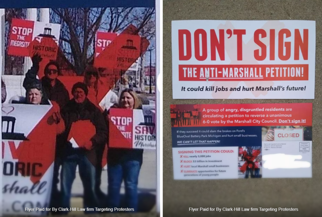 These concerns do not exist in a vacuum. Marshall-area residents who protested or questioned the Marshall Megasite project have already faced paid political targeting, intimidation & harassment by Michigan Citizens for Jobs and Opportunity, a fictional entity created by the Clark-Hill law firm who had just been hired by the City of Marshall. So its okay for the city governments law firm to use its funds to target citizens who have been in vocal oppostion to the Marshall Megasite. Now the same governmental structure wants expanded authority over communications deemed annoying or alarming.