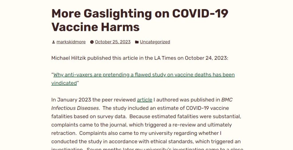 Judging by the very low COVID-19 vaccine booster uptake this fall (less than 3%), it appears that most people are seeing through the smoke. They explicitly or intuitively understand that the COVID-19 vaccines are ineffective and unsafe. I sense the desperation in both the Mr. Hiltzik article and the Mr. Gorski post… as if they are scrambling to keep the lid on a pressure cooker that is about to blow. Perhaps the narrative of COVID-19 vaccine safety is fragile if survey research is receiving this kind of attention. I hope there is a breakthrough and relief soon so that the vaccine-injured can get the medical and financial assistance they need. Journalists have a duty to the people to give a full unbiased accounting lest they mislead the public.
