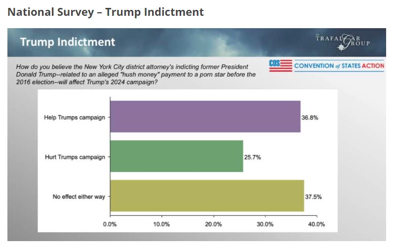“It’s obvious to the majority of Americans that former President Trump is being hounded by a politically-motivated witch hunt designed to discredit him in order to render him a permanent pariah in American politics,” said Mark Meckler, President of Convention of States. “This tactic has never worked, and these early numbers already reveal it’s going to backfire. Voters either think his indictment and arrest will either have absolutely no impact on his 2024 bid, or that it will even boost his campaign.”