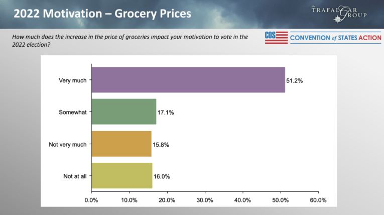 “This data reveals that skyrocketing grocery prices are really starting to hit Americans hard, even beyond the initial pinch they have been feeling due to surging inflation. Voters are keenly aware that this is the result of disastrous and reckless policies being pursued by the Biden Administration such as the so-called ‘Inflation Reduction Act’ which ironically increases spending and therefore further drives inflation,” said Mark Meckler, President of the Convention of States. “Election observers are constantly looking for that one, top of mind issue that is affecting the mood–ultimately the decisions–of the electorate, and when almost 70% of voters indicate they are mad enough about food prices that it makes them more likely to vote, that’s a real-time indicator that it’s an issue which as risen to that status.”