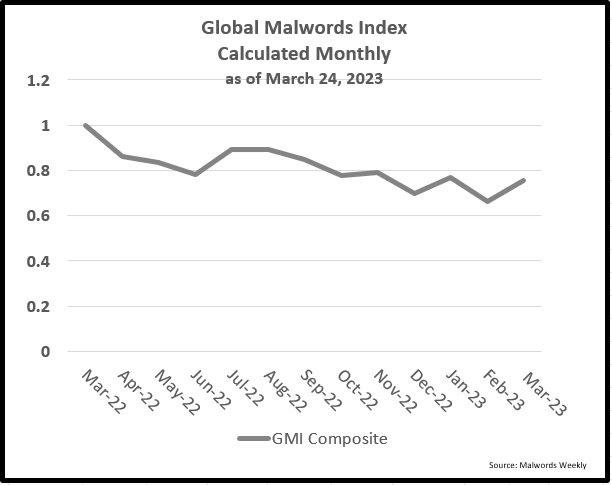 The Global Malword Index (GMI), a volume-weighted composite of twenty key domestic terms, finished unchanged on the week at 0.75. Percent movers are: