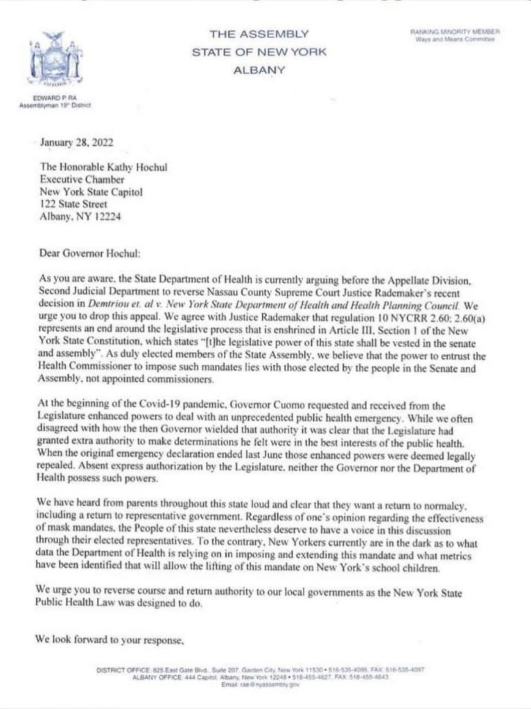 Not many NYS Republicans in either State Assembly or State Senate have come out with statements, or attempted to stop any of these illegal, unconstitutional mandates and regulations for last two years. Only 12 GOP Assembly members (what happened to the other 31?) wrote a letter to Governor Hochul on 1/28/2022 urging him to “reverse the course and return authority” to local government, noting that “original emergency declaration” issued by Governor Cuomo ended on June 2021.