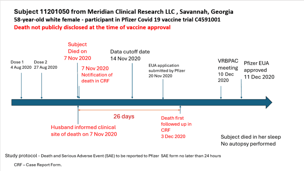 The Kansas case was a 63-year-old woman who had her first dose of the Pfizer mRNA vaccine on August 18, 2020, and a second dose on September 8, 2020. She died on October 19, 2020, and her emergency contact immediately informed the clinical site — Alliance for Multispecialty Research LLC, in Newton, Kansas. Thirty-seven days later, on November 25, 2020 — 11 days after the data reporting cutoff date — the death was finally recorded in a “case report form.”