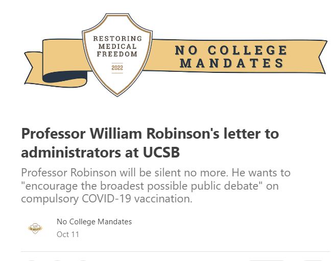 I am a professor at the University of California at Santa Barbara (UCSB). On October 2nd, I sent a letter to administrators in response to an announcement that recently mandated that all faculty, staff, and students must get a new booster this fall. In addition, the administrators responsible for Covid policy changed the language from “fully vaccinated” to “up to date”, suggesting we will be mandated to get a new booster every quarter or every season in perpetuity. At UCSB, in academia, and beyond we have not been allowed to have an open debate on the vaccine mandates much less any democratic input into whether vaccines and boosters should be mandated (for example, at our quarterly Academic Senate legislative meetings, which are supposed to involve open debate, discussion, and voting, those running the meeting have not allowed an open mic, which runs counter to all historic practice and procedures). Anyone who has questioned the official narrative on covid has been ridiculed and censored, accused of being “anti-vaxxers”, “anti-science,” “conspiracy theorists”, and “right wing nuts”. When one points to sound scientific information that contravenes the official narrative it is labeled “misinformation”.