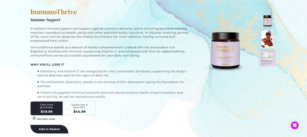 “When I created Holistic Goddess, it was with a deep understanding that the intentional, seemingly small decisions we make daily are indeed powerful self-care acts. ImmunoThrive was born out of the belief that caring for oneself holistically enriches not just the body, but also the mind and spirit. It’s about nurturing our whole selves with every choice, and that’s the commitment we make to our health each time we choose to support it with natural, empowering supplements.”