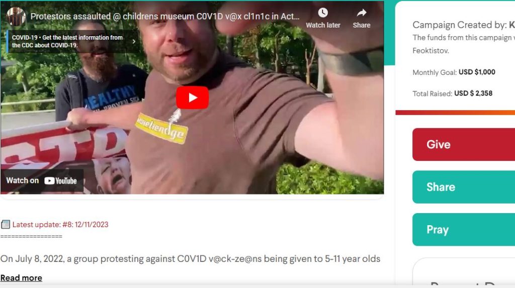 On July 8, 2022, a group protesting against COVID vaccines being given to 5-11-year-olds at a vaccine clinic at the Children’s Discovery Museum in Acton, MA was assaulted by local resident Fred Smith (the man in the video in the brown shirt). Smith was charged with three counts of Assault and Battery with a Dangerous Weapon (a pipe), one count of Assault with a Dangerous Weapon (a pipe), Assault and Battery, and Disorderly Conduct.