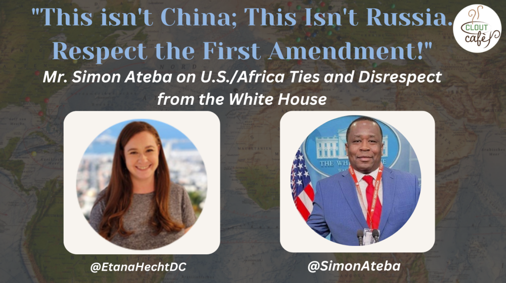Mr. Ateba discussed the disappointing treatment he’s received in the press room from Ms. Karine Jean-Pierre, who has avoided taking a question from him for 7 months. There have been numerous important diplomatic visits between U.S. and African officials in recent months, and Mr. Ateba still has not been given a chance to ask questions during White House press briefings. Mr. Ateba would appreciate calling attention to the threat that China poses to both the U.S. and Africa, and he would appreciate being treated with respect by the White House secretary on behalf of the people of Africa.